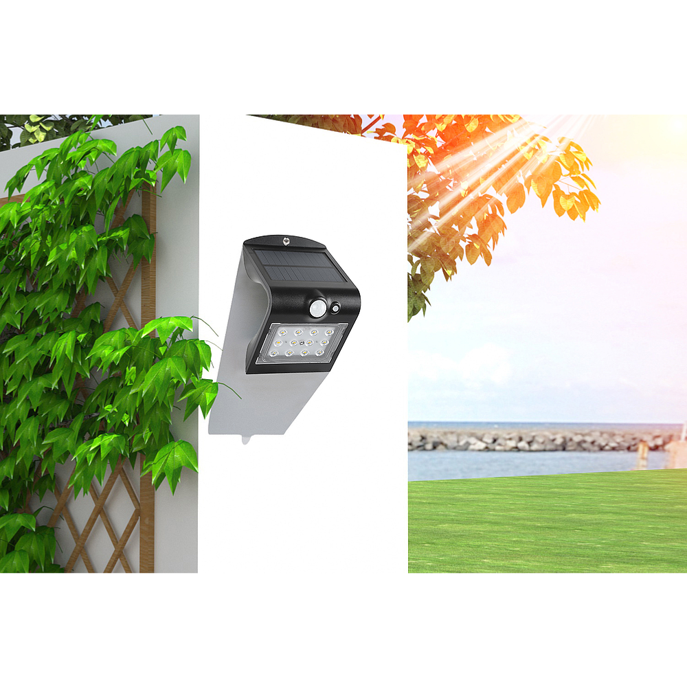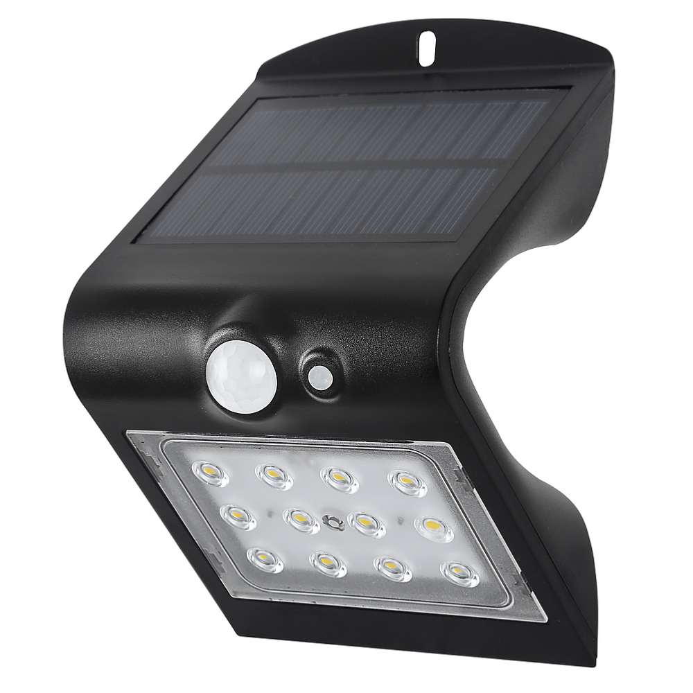 Applique solaire Duo noir 3000°K - 1,5W - 220Lm - détection IR - éclairage avant balisage arrière - faisceau 90° - panneau 0,7W - batterie Li-ion 1200 mAh/3,7V remplaçable / IP65 -polycarbonate-ABS-anti-UV - mode fixe ou veille+détection