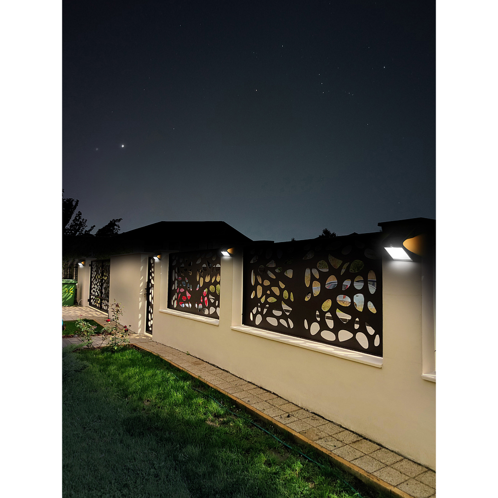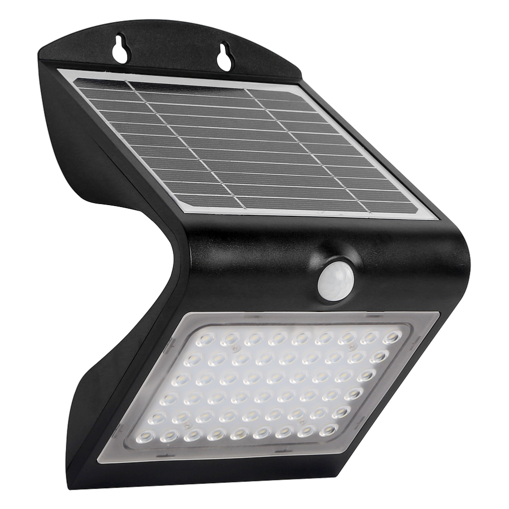 Applique solaire Duo noir 3000°K - 4W - 500Lm - détection IR - éclairage avant balisage arrière - faisceau 90° - panneau2,4W - batterie Li-ion 2000 mAh/3,7V remplaçable / IP65 -polycarbonate-ABS-anti-UV - mode fixe ou veille+détection