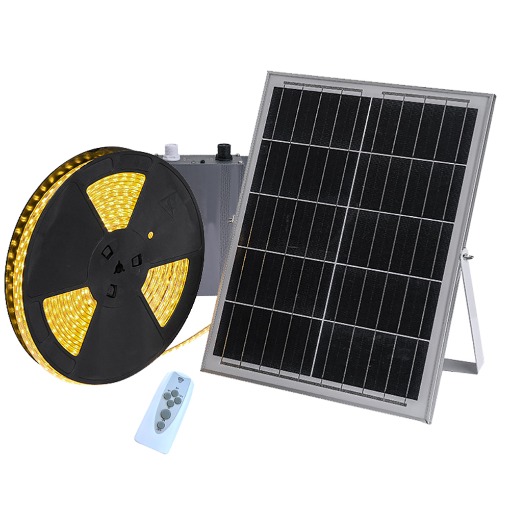 Bandeau Led solaire télécommandé 20m sécable 10m/5m - 2700°K - Faisceau 180° - 1400Lm - Panneau solaire 20W - Batterie Li-ion 15Ah/3,2V - IP65/IK07 - 4 modes possibles - ABS/Polycarbonate/Anti UV - télécommande+batterie+contrôleur inclus