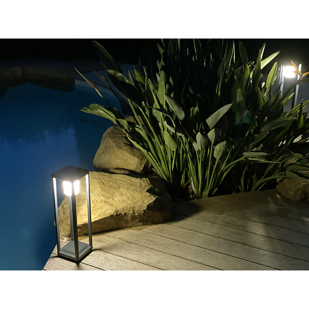 Borne Solaire Roma à détection 50 cm - 3000°K - Faisceau 120° - 300 Lumens - IP55/IK07 - Panneau solaire 2,1 Watts - Batterie Li-ion 2000 mAh/3,7V - Aluminium/Polycarbonate - 4 modes différents - Temps de charge 8h + autonomie 12h