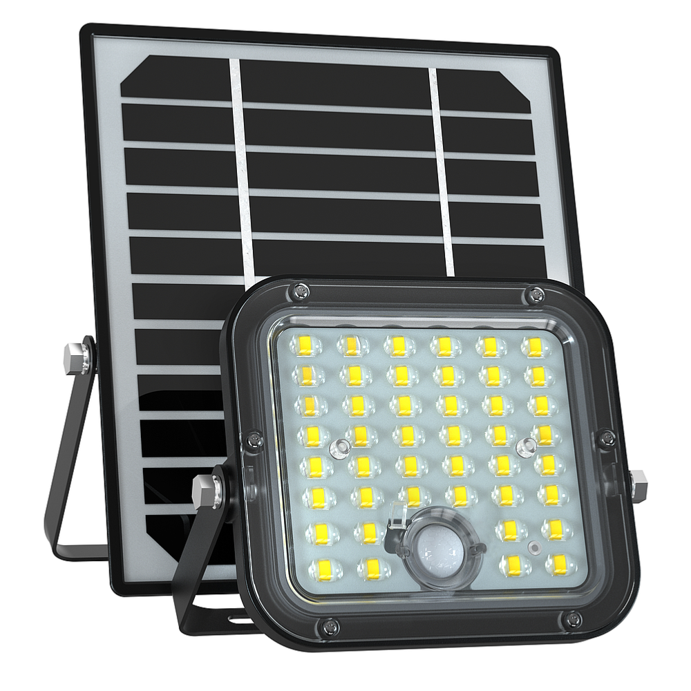 Projecteur solaire 10W télécommandé détection de mouvements / 3000°K /1500Lm / ABS/Aluminium/Polycarbonate/ mode fixe (1500Lm) ou veille+détection (450Lm) / temporisation+intensité réglable